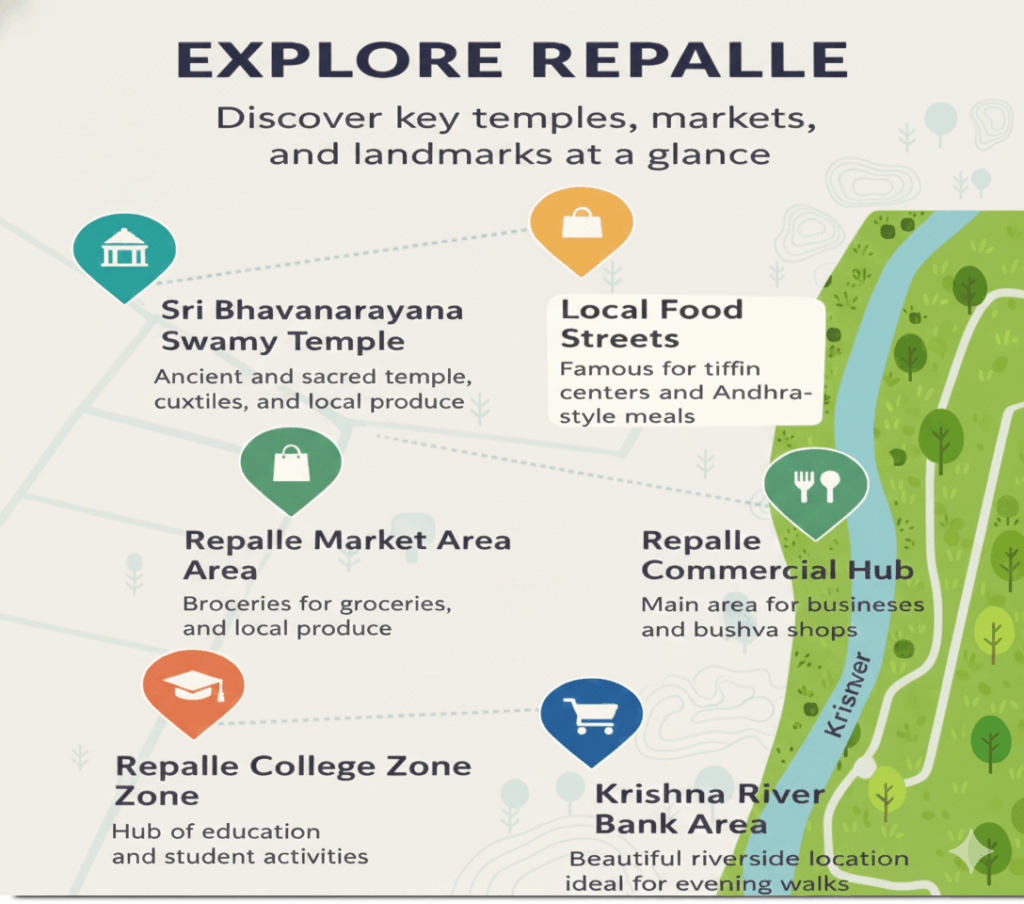 Beyond its natural beauty, Repalle is also recognized for its educational institutions, food culture, and close-knit social life. The townβs peaceful ambiance, coupled with its proximity to nature, makes it an ideal destination for those seeking both relaxation and connection to tradition. From the ancient Sri Bhavanarayana Swamy Temple to the bustling market streets and riverside views, Repalle offers a glimpse into the timeless charm and golden heritage of Andhra Pradesh.With historic temples, local festivals, and growing development, the town blends heritage with modern living.Β